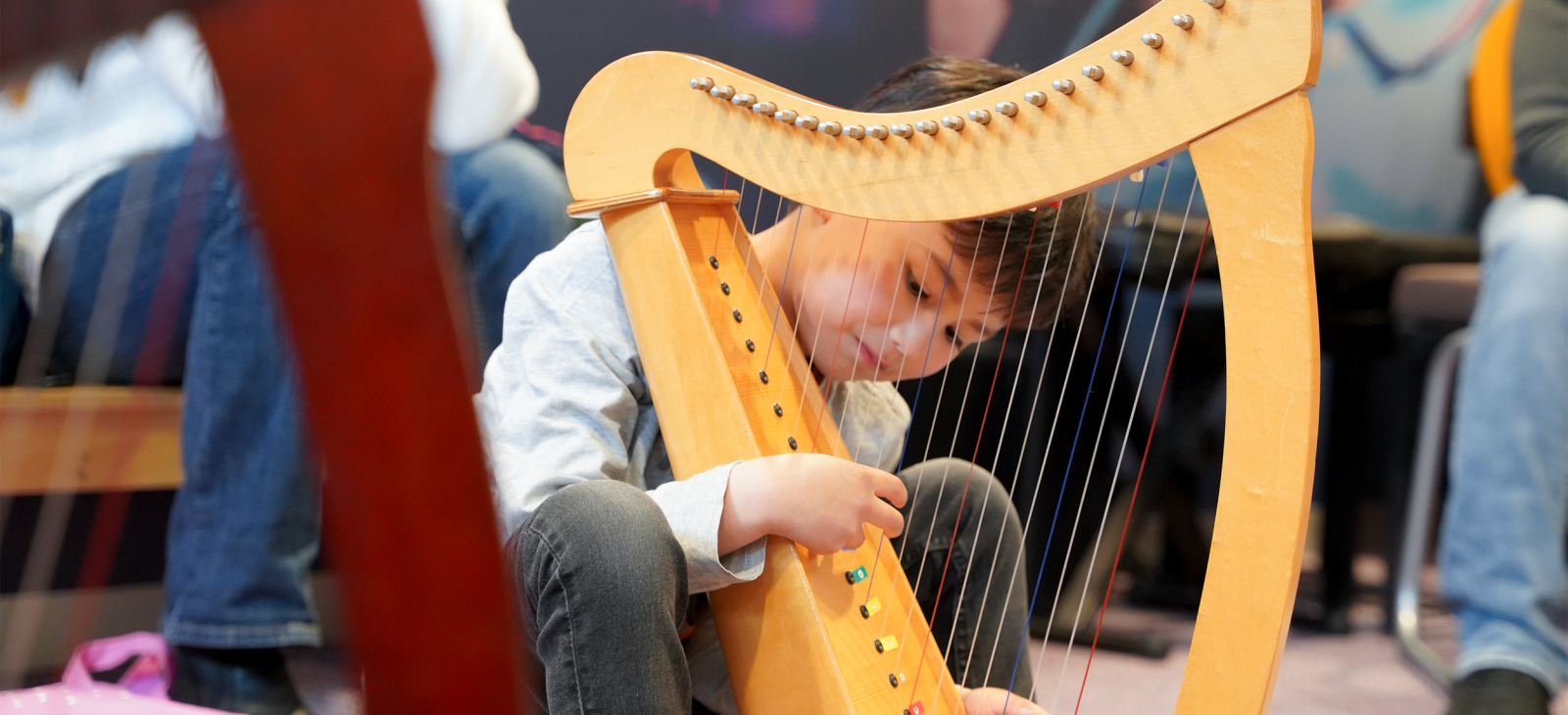 De harp bestaat in verschillende soorten en maten. Bij kleuterharp krijgen de kinderen les op een harp met 20 snaren (tafelharp of troubadourharp). Muziekstukken zijn eigenlijk verhalen en de harp is het instrument waarmee we die verhalen gaan vertellen. Al spelen op de harp ontdekken we samen dat muziek hoog en laag, kort en lang, hard en zacht, langzaam en snel kan klinken. Al spelend leren de kinderen deze klankeigenschappen herkennen en gebruiken. En zo leren zo ook al de notennamen en ritmenotatie.