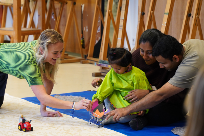 We werken op een groot zeil, dicht bij de grond. De ruimte is veilig, uitnodigend en vol materialen op grijphoogte. Elk kind krijgt een capeschort, maar trek vooral kleding aan die vies mag worden – vies worden hoort erbij!